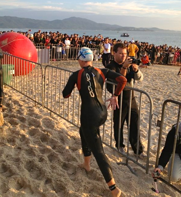 O caminho para a largada foi tenso! A tal da adrenalina tomou conta, minha mãe emocionada e o incentivo de muitos que eu cruzava no caminho para a areia! Não encontrei com ninguém na largada, afinal eram mais de 2.000 atletas, fique perdida e não sabia muito bem onde largar, a orientação do meu técnico, Maurício Letzow, foi largar em uma das extremidades. Uma estava vazia mas seria uma natação por dentro, justo para o lado que a maré estava puxando. Tentei ir na outra extremidade, impossível, com 10% de mulher na prova, era um mar de homem, todos com cara de monstros! rsrsrsrs Me posicionei umas três fileiras da faixa de largada onde tinha um espaço melhor para não largar me empurrando com ninguém. 7h. Helicóptero sobrevoando, o coração acelerado e de repente a faixa levanta e o movimento para o mar começou. Não, eu não escutei a largada! rsrsrsrs